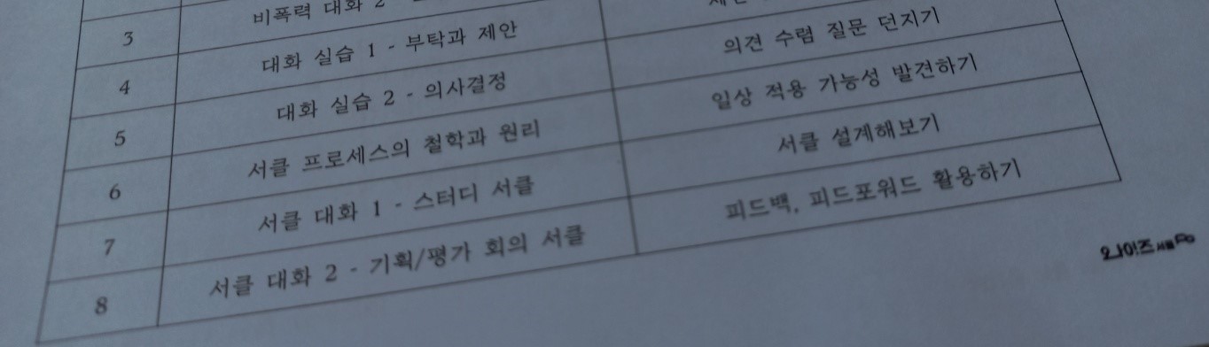 지난 7월부터 주1회 총 8회차에 걸쳐, 우만종합사회복지관에서 근무하시는 직원 분들과 비폭력적인 대화, 협력적 대화, 서클 프로세스 등의 내용으로 함께하고 있습니다. 직장 동료들 사이에, 그리고 늘상 관계 맺으시는 지역 주민들과의 따뜻하고 유익한 소통을 위해서 시간을 내어 같이 실습하고 이야기 나눠가고 있습니다.