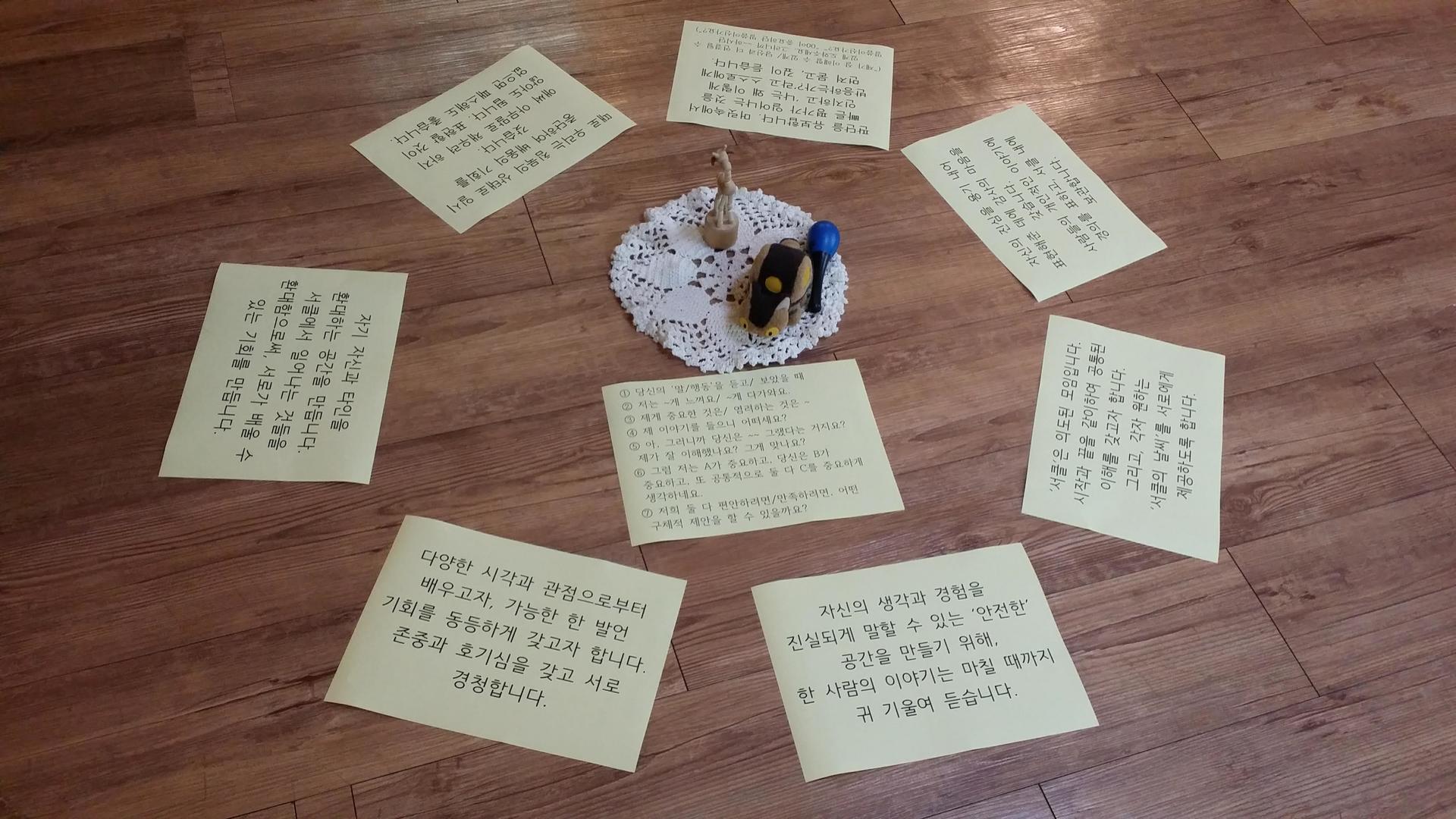 구성원 모두가 경청하려고 노력해주고 존중과 협력을 위한 약속에 동의해준다면, 나머지 주제에 관한 자기표현들과 역할분담, 의사결정 등은 자연스럽게 진행될 수 있다는 점을 참여자들과의 활동을 통해 다시 한 번 확인할 수 있었습니다.