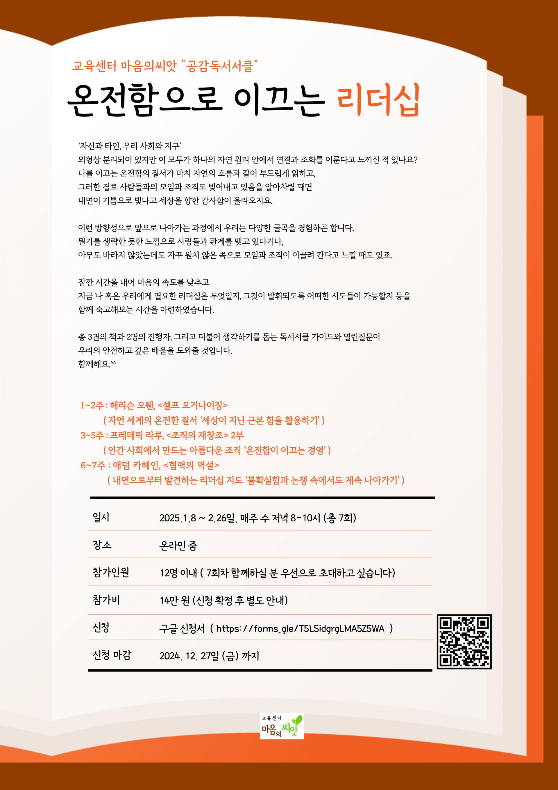 잠깐 시간을 내어 마음의 속도를 낮추고 지금 나 혹은 우리에게 필요한 리더십은 무엇일지, 그것이 발휘되도록 어떠한 시도들이 가능할지 등을 함께 숙고해보는 시간을 마련하였습니다. 총 3권의 책과 2명의 진행자, 그리고 더불어 생각하기를 돕는 독서서클 가이드와 열린질문이 우리의 안전하고 깊은 배움을 도와줄 것입니다. 함께해요.^^