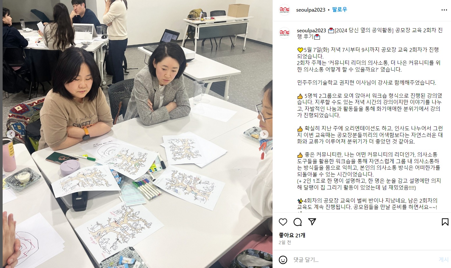 많은 관심 바랍니다~^^ ( 신청하기 : [2024 당신 옆의 공익활동] 모임(2) - 외로움을 지원하는 사람들 공모원 모집 > 센터소식게시판 - 서울시공익활동지원센터 (seoulpa.kr) )