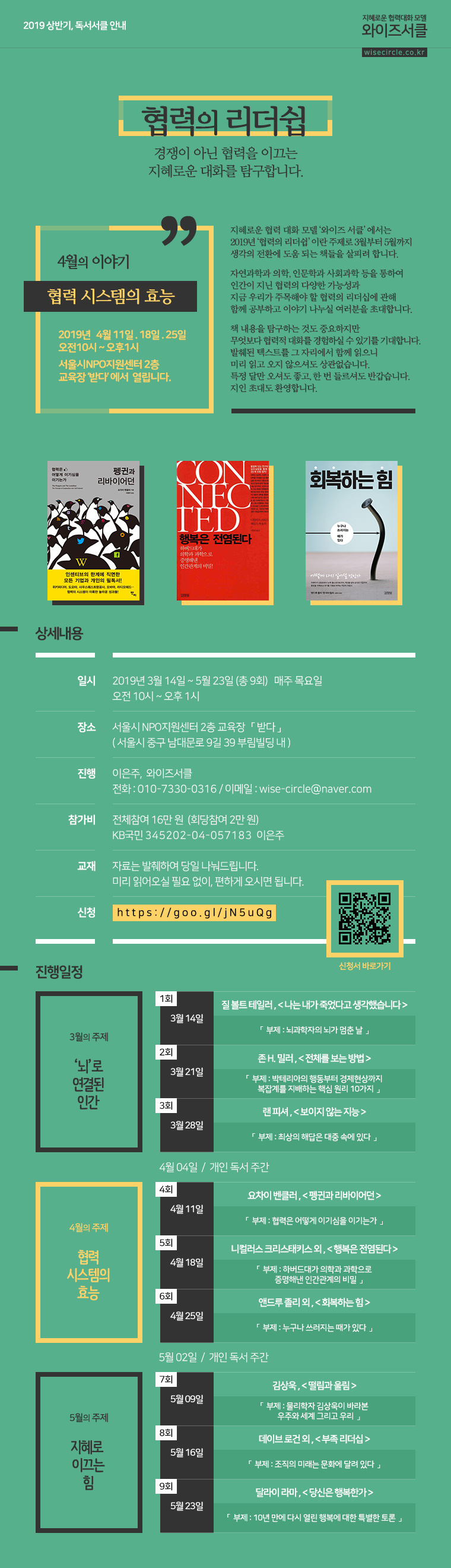 지혜로운 협력 대화 모델 '외이즈 서클'에서는 2019년 '협력의 리더십'이란 주제로 3월부터 5월까지 생각의 전환에 도움 되는 책들을 살피려 합니다. 자연과학과 의학, 인문학과 사회과학 등을 통하여 인간이 지닌 협력의 다양한 가능성과 지금 우리가 주목해야 할 협력의 리더십에 관해 함께 공부하고 이야기 나누실 여러분을 초대합니다.