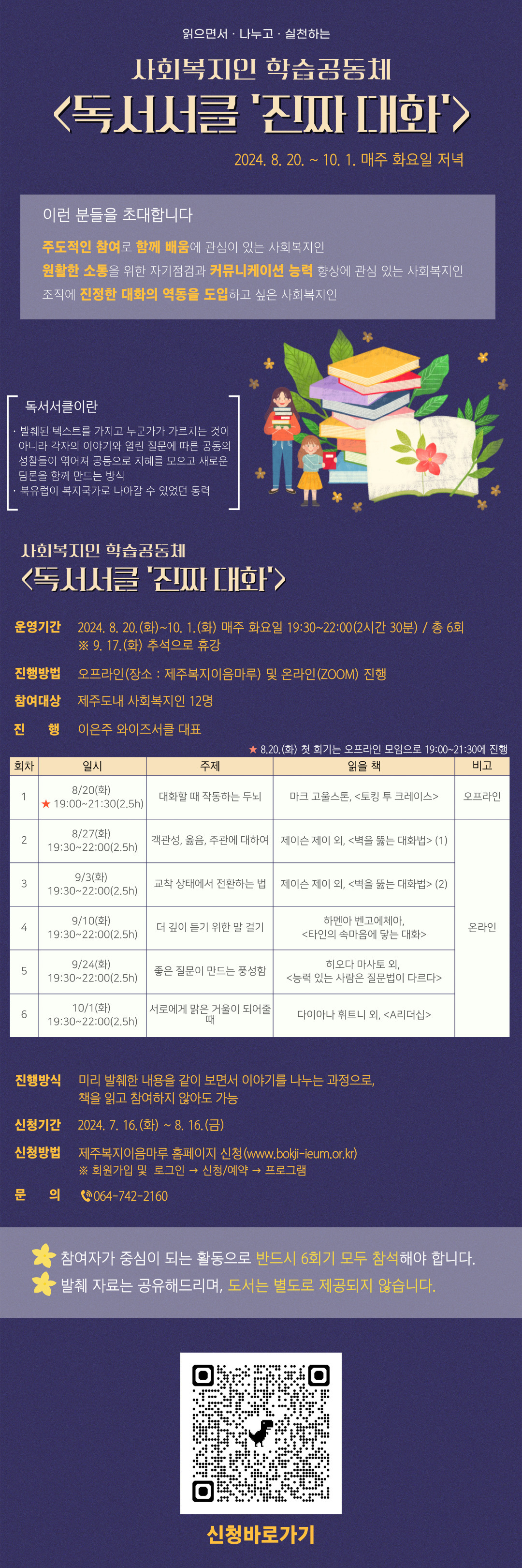 2024. 8. 20 (화) ~ 10. 1 (화) 매주 화요일 19:30 ~ 22:00 (2시간 30분) / 총 6회