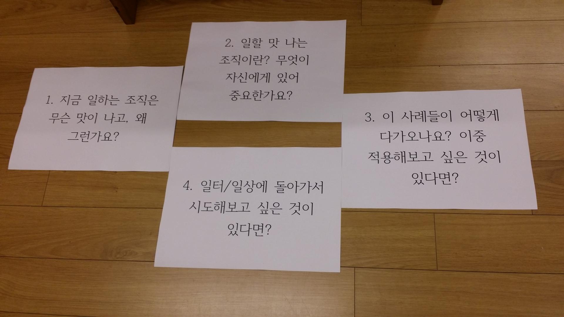 두 번째 질문이 본격적이었다. “일할 맛 나는 조직이란 어떤 조직이라고 생각하나요? 무엇이 자신에게 있어서 중요한가요?” 몹시 다양하면서도 공통되었다. 다섯 명이서 두 번씩 발언 기회를 가지면서 포스트잇 한 뭉치를 거의 다 소진하고, 넓은 화이트보드에 전부를 붙였다. 우리는 구성원 개인들의 행복과 균형 있는 삶부터 서로 간의 소통과 역할 나눔, 조직 자체가 지닌 목표나 NPO들이 사회에서 지니는 위치나 의미들까지를 두루 살폈다. 수용과 인정, 공정함과 평등, 참여와 권한, 함께 도우며 성장하기, 변화와 콜라보, 협력, 사회적 기여 등에 해당되는 이야기들이 모였고, 세 번째 질문으로 넘어가기에 앞서 호스트인 나는 <조직의 재창조>라는 책에서 소개된 12개 조직 사례들을 잠깐 공유하였다.