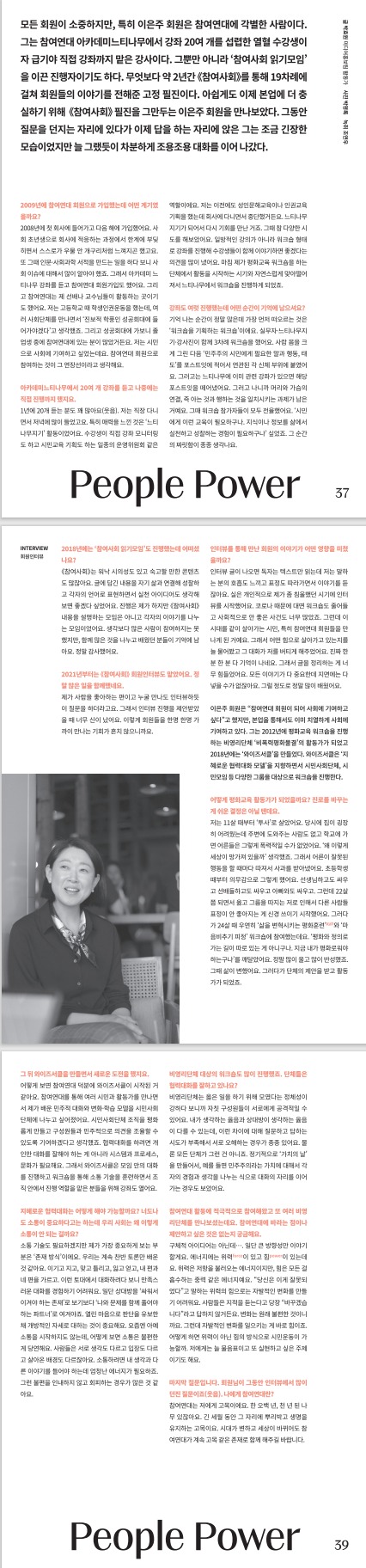모든 회원이 소중하지만, 특히 이은주 회원은 참여연대에 각별한 사람이다. 그는 참여연대 아카데미느티나무에서 강좌 20여 개를 섭렵한 열혈 수강생이자 급기야 직접 강좌까지 맡은 강사이다. 그뿐만 아니라 ‘참여사회 읽기모임’을 이끈 진행자이기도 하다. 무엇보다 약 2년간 《참여사회》를 통해 19차례에 걸쳐 회원들의 이야기를 전해준 고정 필진이다. 아쉽게도 이제 본업에 더 충실하기 위해 《참여사회》 필진을 그만두는 이은주 회원을 만나보았다. 그동안 질문을 던지는 자리에 있다가 이제 답을 하는 자리에 앉은 그는 조금 긴장한 모습이었지만 늘 그랬듯이 차분하게 조용조용 대화를 이어 나갔다.