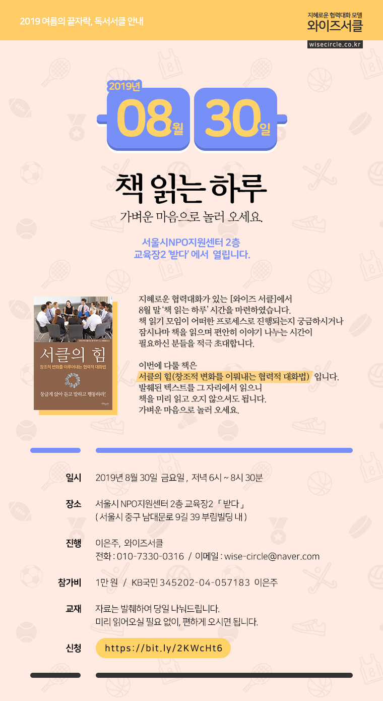 지혜로운 협력대화가 있는 [와이즈 서클]에서 8월 말 '책 읽는 하루' 시간을 마련하였습니다. 책 읽기 모임이 어떠한 프로세스로 진행되는지 궁금하시거나 잠시나마 책을 읽으며 편안히 이야기 나누는 시간이 필요하신 분들을 적극 초대합니다. 이번에 다룰 책은 서클의 힘(창조적 변화를 이뤄내는 협력적 대화법) 입니다. 발췌된 텍스트를 그 자리에서 읽으니 책을 미리 읽고 오지 않으셔도 됩니다. 가벼운 마음으로 놀러 오세요.